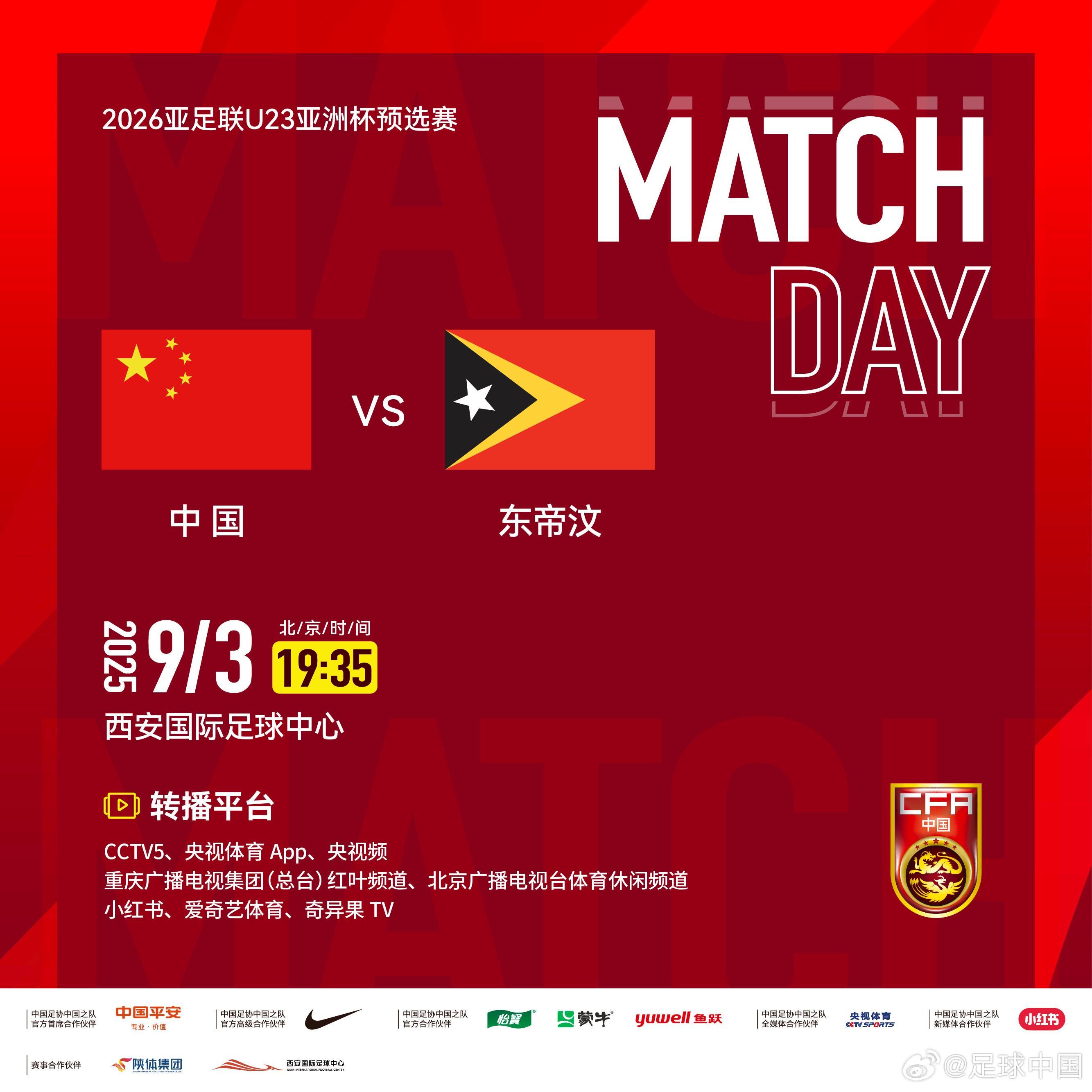 官方:CCTV5+将转播U22国足vs北马里亚纳群岛U22