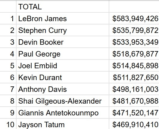 1 勒布朗-詹姆斯 583,949,426美元